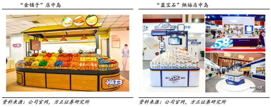 經(jīng)典案例:根據(jù)公司官網(wǎng)、方正證券研究所等綜合資訊表明,鹽津鋪?zhàn)庸鹃_(kāi)始通過(guò)店中島模式實(shí)現(xiàn)單一品牌商品集中陳列,增加品牌曝光,實(shí)現(xiàn)差異化營(yíng)銷(xiāo),在商超賣(mài)場(chǎng)中有效構(gòu)建品牌壁壘。公司在大型商超投放“金鋪?zhàn)?rdquo;店中島,2018 年門(mén)店銷(xiāo)售同比增長(zhǎng)超 50%; “藍(lán)寶石”烘焙店中島同樣引起轟動(dòng),成功確立了“58 天鮮”在短促烘焙行業(yè)的行業(yè)地位,門(mén)店銷(xiāo)售大幅增長(zhǎng)。