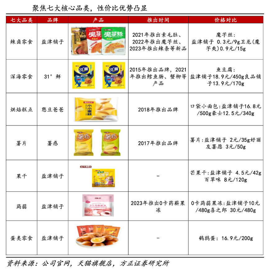 經(jīng)典案例:根據(jù)公司官網(wǎng)、天貓旗艦店、方正證券研究所等綜合資訊表明,自 2021 年按照“多品牌、多品類(lèi)、 全渠道、全產(chǎn)業(yè)鏈、(未來(lái))全球化”中長(zhǎng)期戰(zhàn)略發(fā)力以來(lái),鹽津鋪?zhàn)庸咀龃笞鰪?qiáng)“鹽津鋪?zhàn)?rdquo;辣鹵零食、“31°鮮”深海零食,“憨豆爸爸”烘焙食品、“薯之惑”焙烤薯 片、蛋類(lèi)零食“蒟蒻滿分”蒟蒻果凍、果干堅(jiān)果七大核心品類(lèi),產(chǎn)品品牌定位“好 吃不貴,國(guó)民零食”,實(shí)現(xiàn)高品質(zhì)+高性價(jià)比的產(chǎn)品。