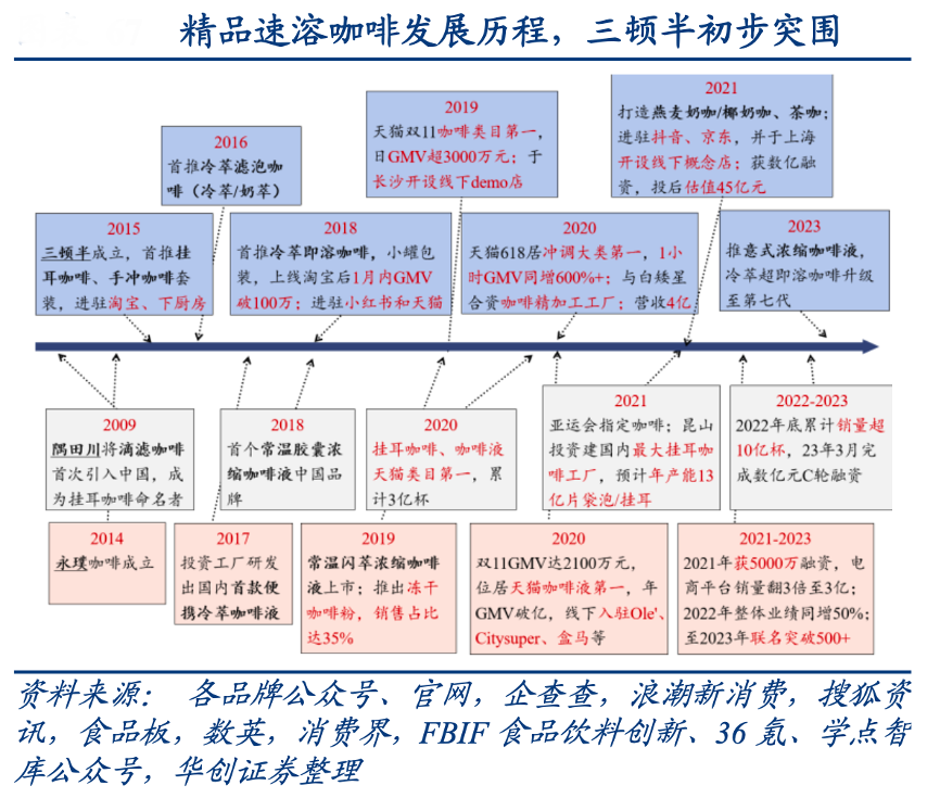 經(jīng)典案例:根據(jù)各品牌公眾號、官網(wǎng)、企查查、浪潮新消費(fèi)、搜狐資訊、食品板、數(shù)英、消費(fèi)界、FBIF食品飲料創(chuàng)新、36氪、學(xué)點(diǎn)智庫公眾號、華創(chuàng)證券等綜合資訊表明,三頓半創(chuàng)立于 2015 年,但此前創(chuàng)始人已有 7 年咖啡館從業(yè)經(jīng)驗(yàn),推出“小罐子即溶咖啡”后迅速走紅全網(wǎng),成為速溶行業(yè)第二,可以說是精品咖啡代表。