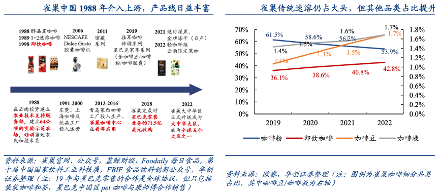 經(jīng)典案例:根據(jù)雀巢官網(wǎng)、公眾號、藍(lán)鯨財經(jīng)、Foodaily每日食品、第十屆中國國家飲料工業(yè)科技展、FBIF食品飲料創(chuàng)新公眾號、歐睿、華創(chuàng)證券等綜合資訊表明,近年來中國咖啡市場高速增長,近年來雀巢 1+2 傳統(tǒng)速溶基本穩(wěn)定,咖啡液和膠囊貢獻(xiàn)主要增量,公司也積極加碼精品 咖啡,自 2018 年收購星巴克零售咖啡業(yè)務(wù)后,現(xiàn)已培育濃縮咖啡、袋泡咖啡、冷萃咖啡液、冷萃凍干粉全產(chǎn)品矩陣,甚至在線上布局膠囊咖啡機(jī)。