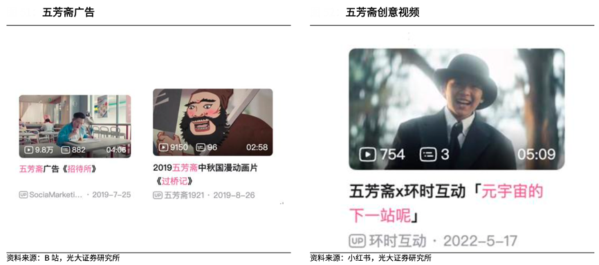 經(jīng)典案例:根據(jù)B站、小紅書、光大證券研究所等綜合資訊表明,五芳齋依靠互聯(lián)網(wǎng)賦能,不斷進(jìn)行營銷破圈推廣品牌,觸達(dá)年輕人心智,努力向年輕消費(fèi)人群貼近。例如 2019 年端午節(jié)推出的科幻風(fēng)短片《招待所》和同年中秋的國漫廣告《過橋記》吸 粉無數(shù)。2022 年,推出首位 AI 虛擬藝人——五糯糯,以五芳齋節(jié)令文化主理人的身份與消費(fèi)者,尤其是 Z 時(shí)代年輕人一起分享好吃、好看、好玩的 五芳齋節(jié)令美食。
