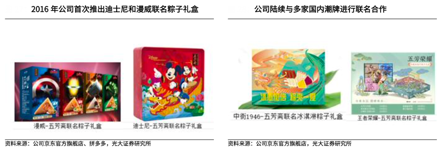 經(jīng)典案例:根據(jù)公司京東官方旗艦店、拼多多、光大證券研究所等綜合資訊表明,五芳齋聯(lián)名潮流品牌,吸引新時(shí)代消費(fèi)群體。2016年公司首次與迪士尼、漫威聯(lián)名合作推出 IP 禮盒,此后陸續(xù)開(kāi)始和國(guó)內(nèi)盒馬鮮生、喜茶、樂(lè)事、鐘薛高等品牌達(dá)成合作,打造時(shí)尚粽子單品,吸引了眾多的年輕消費(fèi)者。