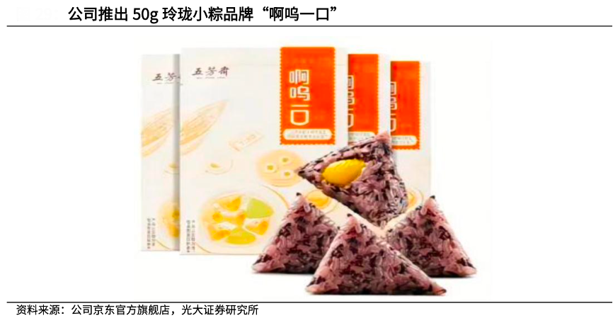 經(jīng)典案例:根據(jù)公司京東官方旗艦店、光大證券研究所等綜合資訊表明,五芳齋為了迎合粽子產(chǎn)品的小型化和健康化發(fā)展趨勢(shì),于2022 年推出了一款 50g 的“啊嗚一口”玲瓏小粽。這款產(chǎn)品不僅熱量較低,還因其小巧的包裝而適合作為休閑零食食用。此外,公司持續(xù)研發(fā)出各種新口味,如佛跳墻粽、鮑魚(yú)粽、螺 螄粉粽、臘肉粽等,為有不同飲食習(xí)慣的消費(fèi)者提供了多樣化的選擇。