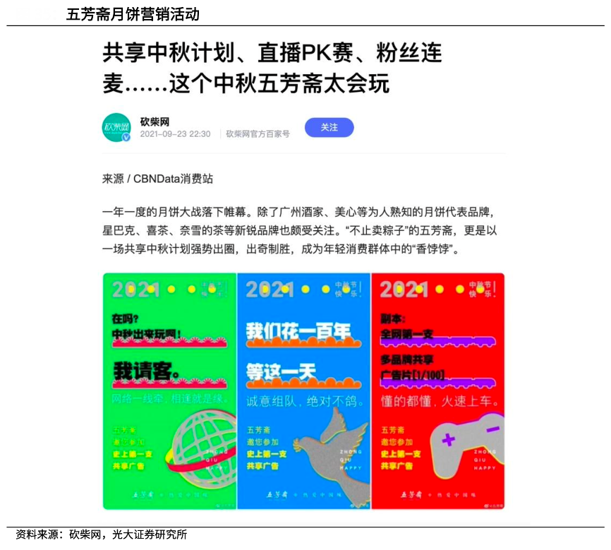 經(jīng)典案例:根據(jù)砍柴網(wǎng)、光大證券研究所等綜合資訊表明,五芳齋以用戶思維進(jìn)行營(yíng)銷,對(duì)渠道、類型進(jìn)行分類圈層種草。五芳齋結(jié)合多種年輕化 玩法,保持品牌活力,通過(guò)產(chǎn)品的品質(zhì)感、話題性吸引追求新鮮感的年輕消費(fèi)群體。2021 年的中秋營(yíng)銷活動(dòng)中,五芳齋更是聯(lián)合多家品牌,開(kāi)啟了五芳齋共享中秋計(jì)劃,在視頻中與多家品牌進(jìn)行合作,打造了行業(yè)首支共享廣告視頻,獲得了線上線下諸多消費(fèi)者的熱議與好評(píng)。