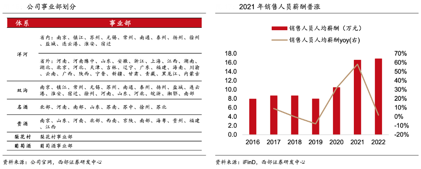 經(jīng)典案例:根據(jù)公司官網(wǎng)、iFinD、西部證券研發(fā)中心等綜合資訊表明,洋河股份公司圍繞“營(yíng)銷(xiāo)總部管總、事業(yè)部管戰(zhàn)”推動(dòng)營(yíng)銷(xiāo)組織架構(gòu)調(diào)整,實(shí)現(xiàn)機(jī)構(gòu)、責(zé)任下沉?,F(xiàn)各部門(mén)分工明確互為配合,經(jīng)營(yíng)端分品牌設(shè)立組織單位,渠道端按不同品牌及區(qū)域劃分 80 個(gè)事業(yè)部,進(jìn)行扁平化管理;公司注重營(yíng)銷(xiāo)體系的建設(shè),2021 年銷(xiāo)售人員薪酬普漲,并實(shí)行寬帶薪酬制度,加大薪酬方差調(diào)動(dòng)基層員工積極性。