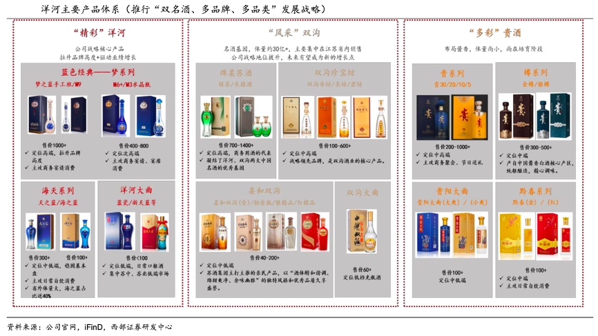 經(jīng)典案例:根據(jù)公司官網(wǎng)、iFinD、西部證券研發(fā)中心等綜合資訊表明,洋河股份公司目前有洋河、雙溝及貴酒三大品牌,覆蓋禮贈(zèng)/商務(wù)/宴席/自飲等細(xì)分消費(fèi)場(chǎng)景,且在千元以?xún)?nèi)各個(gè)價(jià)格帶均有拳頭產(chǎn)品,產(chǎn)品矩陣豐富。其中高端品拉升品牌形象旨在舉高打低,次高端為增長(zhǎng)引擎推動(dòng)結(jié)構(gòu)升級(jí),中低端筑基穩(wěn)固,提供堅(jiān)實(shí)后盾,各線產(chǎn)品互為補(bǔ)充。