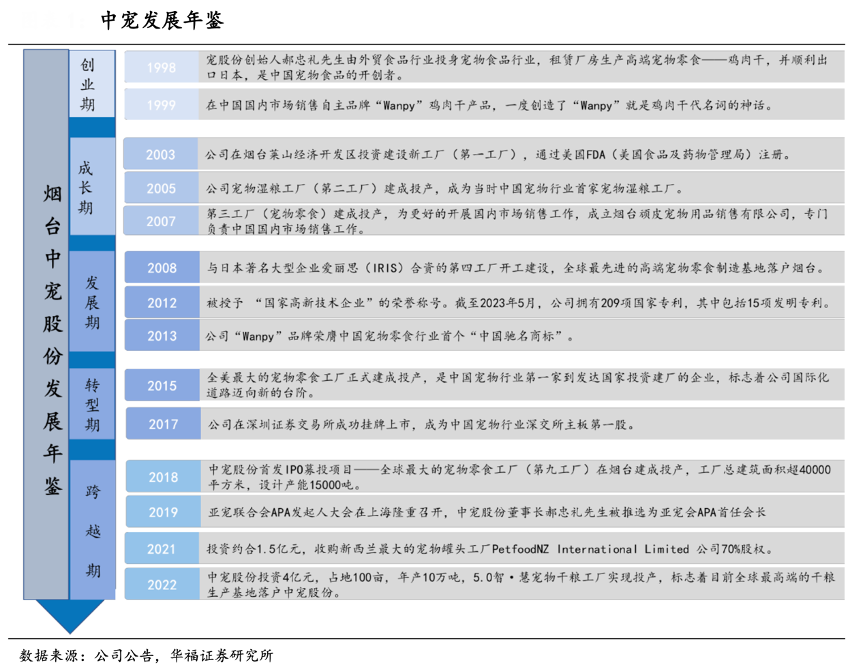 經典案例:根據(jù)公司公告、華福證券研究所等綜合資訊表明,中寵股份成立于 1998 年,2014 年開始,在進一步鞏固代工業(yè)務的基礎上,公司積極轉型,重點發(fā)力自有品牌建設,截止目前,已經打造了“Wanpy 頑皮”、“Zeal 真致”、“Toptrees 領先”為核心的差異化品牌矩陣。從產品端來看,公司覆蓋主糧、罐頭、零食、保健品等品類產品, 擁有超 1000 款 SKU,能夠滿足全域消費者的需求。