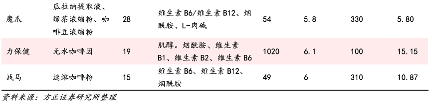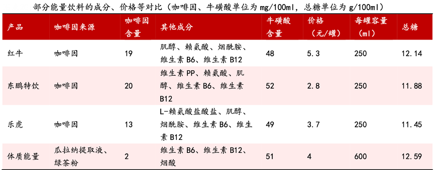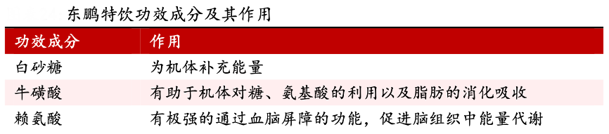 經(jīng)典案例:根據(jù)公司公告、方正證券研究所等綜合資訊表明,東鵬特飲富含?;撬?、賴氨酸、多種 B 族維生素和其他營 養(yǎng)成分,并添加藥品級咖啡因,其中,?;撬岜Wo心肌,煙酸、B6、B12 對能量 代謝有加速和刺激作用,咖啡因促使思維變得敏捷清晰、減少疲勞,賴氨酸提高人體注意力,形成一個完整的抗疲勞體系。