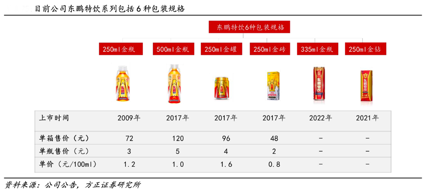 經(jīng)典案例:根據(jù)公司公告、方正證券研究所等綜合資訊表明,目前,東鵬特飲已經(jīng)有 6 種包裝規(guī)格,500ml 金瓶、250ml 金瓶、250ml 金罐、 335ml金罐、250ml 金磚和 250ml 金鉆。根據(jù)尼爾森 IQ 報(bào)告,2023 上半年?yáng)|鵬特飲在中國(guó)能量飲料市場(chǎng)中銷(xiāo)售量占比由 2022 年的 36.7%提升至 40.86%,排名 保持第一;銷(xiāo)售額占比由 2022 年末的 26.62%提升至 29.06%,排名維持第二。