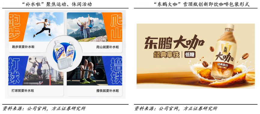 經(jīng)典案例:根據(jù)公司官網(wǎng)、方正證券研究所等綜合資訊表明,東鵬特飲公司在能量飲料大單品東鵬特飲之外,還有即飲咖啡、電解質(zhì)水、檸檬茶、涼茶 等品類,特別是近兩年陸續(xù)推出的“東鵬大咖”和“東鵬補(bǔ)水啦”,處于市場(chǎng)增 速較快即飲咖啡和運(yùn)動(dòng)飲料賽道,其中“補(bǔ)水啦”2023 年 1 月在廣東試點(diǎn),4 月 推向全國(guó)市場(chǎng),反響較好。