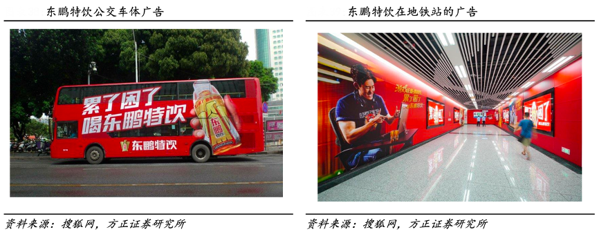 經(jīng)典案例:根據(jù)搜狐網(wǎng)、方正證券研究所等綜合資訊表明,在宣傳密度方面,2019年?yáng)|鵬特飲公司推行了飽和式的營(yíng)銷策略,加強(qiáng)和消費(fèi)者日常更貼近 的、接觸更頻繁的“地面廣告”,包括公交車、候車亭、T 牌、墻體廣告等。“地 面廣告”提高了消費(fèi)者的覆蓋密度,同時(shí)也降低了公司宣傳推廣成本。