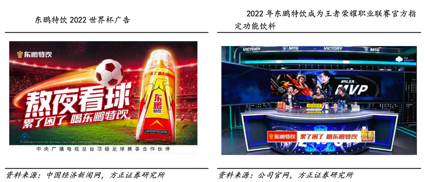 經(jīng)典案例:根據(jù)公司官網(wǎng)、中國(guó)經(jīng)濟(jì)新聞網(wǎng)、方正證券研究所等綜合資訊表明, 2018 年俄羅斯世界杯和 2022 年卡塔爾世界杯期間,公司兩度榮任央視總臺(tái)頂級(jí)足球賽事合作伙伴,能量飲料天然契合體育賽事,高效能投放快速擴(kuò)大東鵬特飲品牌力,持續(xù)放大品牌聲量。此外,2022 年?yáng)|鵬特飲成為王者榮耀職業(yè)聯(lián)賽官方指定功能飲料,在 217 個(gè)比賽日里以多方位的廣告形式將品牌植入賽事,著重深耕電競(jìng)?cè)巳骸?
