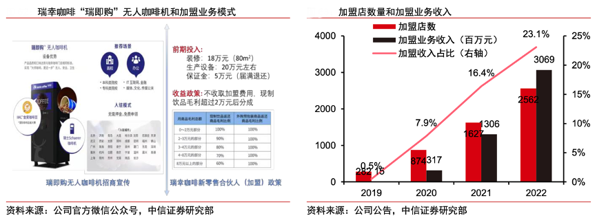 經(jīng)典案例:根據(jù)公司官方微信公眾號(hào)、公司公告、中信證券研究部等綜合資訊表明,依托公司強(qiáng)大的中臺(tái),瑞幸采用輕資產(chǎn)模式+新零售業(yè)務(wù)多線(xiàn)擴(kuò)張,優(yōu)化投入變現(xiàn)。公司通過(guò)加盟(聯(lián)營(yíng))這一相對(duì)輕資產(chǎn)的業(yè)務(wù)模式降低品牌擴(kuò)張的資金壓力,同時(shí)提高供應(yīng)鏈整體的產(chǎn)能利用率,優(yōu)化品牌端和供應(yīng)鏈端的投資收益水平。至 2022 年底,瑞幸咖啡加盟店共 2,562 家,占總門(mén)店數(shù)的 31%; FY2022 加盟貢獻(xiàn)收入 30.7 億元,占總收入的 23.1%。