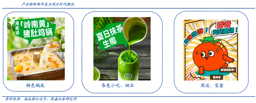 經(jīng)典案例:根據(jù)海底撈公眾號、國盛證券研究所等綜合資訊表明,海底撈 的推新頻率頗高,在菜品創(chuàng)新及融合上做到極具特色,同時迎合當(dāng)代年輕人喜好,推出網(wǎng)紅產(chǎn)品,每次推出新品都能在各大網(wǎng)絡(luò)平臺掀起一股潮流。同時海底撈會根據(jù)不同地區(qū)飲食習(xí)慣推出地區(qū)特定菜單,除官網(wǎng)上公布的經(jīng)典鍋底外,還有如廣州海南地區(qū)的牛肉湯鍋底、青椒鍋底、參鮑雞金湯鍋;天津、山東地區(qū)的雞湯豆花鍋底等。