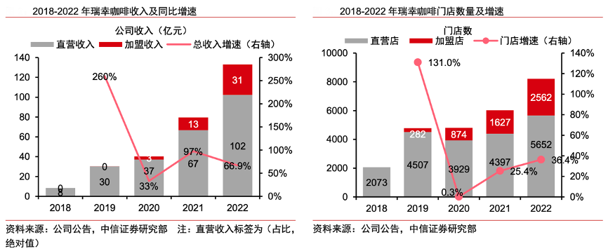 經(jīng)典案例:根據(jù)公司公告、中信證券研究部等綜合資訊表明,瑞幸咖啡公司 2022 年收入達(dá)到 133 億元、同比+66.9%,2018-22 年 CAGR 達(dá) 99%,快速開店和同店高增共同驅(qū)動(dòng)收入強(qiáng)勢(shì)增長(zhǎng)。FY2022 收入構(gòu)成上 77%來(lái)自直營(yíng)門店、瑞即購(gòu)等直營(yíng)渠道銷售,23%來(lái)自加盟店。
