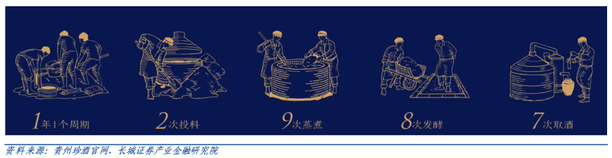 經(jīng)典案例:根據(jù)貴州珍酒官網(wǎng)、長城證券產(chǎn)業(yè)金融研究院等綜合資訊表明,在釀造工藝 方面,珍酒堅守傳統(tǒng)大曲醬香釀造工藝和流程,約 11 個月一個周期,2 次投料,端午制曲,重陽下沙,9 次蒸煮,8 次發(fā)酵,7 次取酒,長期珍藏。一瓶珍酒的誕生,從釀造到 出廠銷售,至少要經(jīng)過 5 年以上時光與歲月的沉淀。