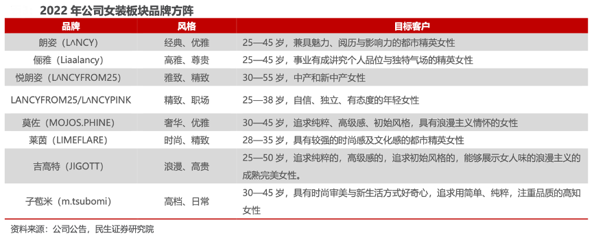 經(jīng)典案例:根據(jù)公司公告、民生證券研究院等綜合資訊表明,朗姿股份公司7 大品牌通 過差異化的產(chǎn)品定位及設(shè)計風(fēng)格,可迎合不同層次女性群體的差異化需求。“朗姿”為女裝板塊核心品牌,定位于為兼具魅力、閱歷與影響力的都市精英女性提供多場合系列服裝的高端女裝品牌。2018 年至 2021 年朗姿品牌營業(yè)收入從 9.64 億元增 長至 12.29 億元,營收持續(xù)增長,CAGR 達 8.43%,貢獻女裝板塊主要營業(yè)收入。