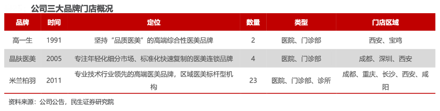 經(jīng)典案例:根據(jù)公司公告、民生證券研究院等綜合資訊表明,朗姿通過”1+N“戰(zhàn)略形成中心輻射形態(tài)迅速擴張醫(yī)美板圖。在特定區(qū)域內(nèi)以一家或多家大型機構(gòu)縱深布局積累品牌口碑,再以若干家小型連鎖機構(gòu)或診所擴大 人群覆蓋范圍并與核心機構(gòu)形成協(xié)同,實現(xiàn)客群相互導(dǎo)流輸送。目前已擁有 29 家 醫(yī)療美容機構(gòu),其中綜合性醫(yī)院5 家、門診部或診所 24 家,主要分布在成都、西 安、重慶、深圳、長沙、寶雞和咸陽等地區(qū)。