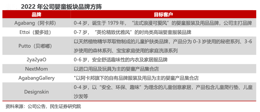經(jīng)典案例:根據(jù)公司公告、民生證券研究院等綜合資訊表明,朗姿公司投資的韓國(guó)阿卡邦公司為韓國(guó)知名嬰童產(chǎn)品公司,旗下共有 10 多個(gè)系列品牌。愛多娃為公司國(guó)內(nèi)市場(chǎng)主推高端童裝品牌,2018 年至 2021 年?duì)I收增 速較快,由 1.30 億元增長(zhǎng)至 2.84 億元,CAGR 達(dá) 29.76%。2022 年上半年嬰童 業(yè)務(wù)總營(yíng)收 4.06 億,同比下降0.45%,主要受韓幣匯率變動(dòng)影響。