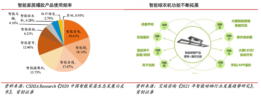 經(jīng)典案例:根據(jù)CSHIA Research《2020中國(guó)智能家居生態(tài)發(fā)展白皮書(shū)》、艾瑞咨詢《2021年智能晾曬行業(yè)發(fā)展趨勢(shì)研究》、首創(chuàng)證券等綜合資訊表明,結(jié)合中國(guó)智能家居產(chǎn)業(yè)聯(lián)盟 CSHIA Research 發(fā)布的《2020中國(guó)智能家居生態(tài)發(fā)展白皮書(shū)》,2020年我國(guó)智能家居爆款產(chǎn)品使用頻率中,智能晾衣機(jī) 占比 4.28%。在功能拓展方面,2021 年 7 月 15 日,艾瑞咨詢發(fā)布《2021 年智能晾曬行業(yè)發(fā)展趨勢(shì)研究》報(bào)告,報(bào)告顯示我國(guó)智能晾曬企業(yè)為搶占市場(chǎng)擴(kuò)大銷售額,不斷進(jìn)行產(chǎn)品升級(jí)與技術(shù)革新,智能晾曬產(chǎn)品功能持續(xù)延展和豐富。