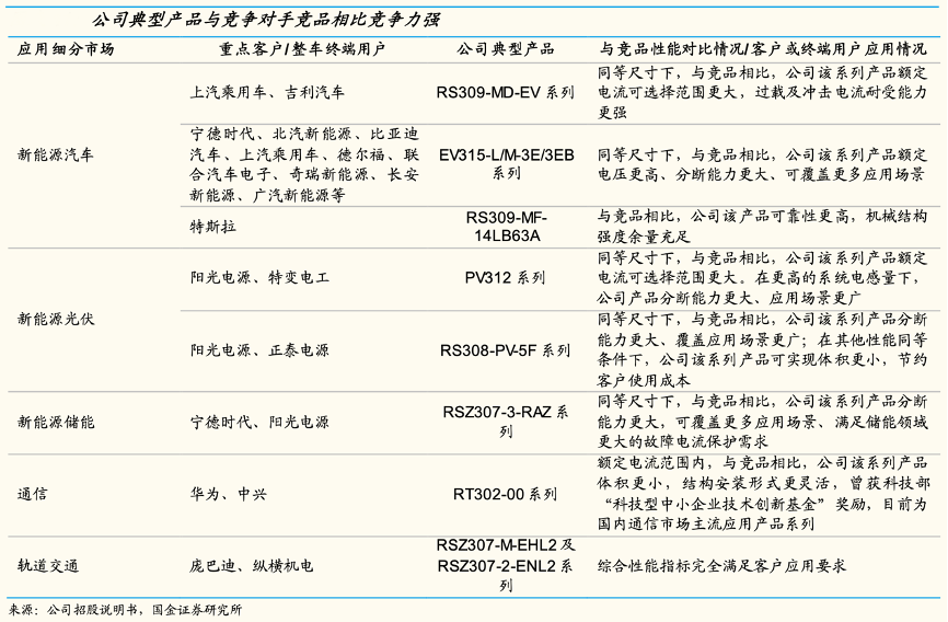 經(jīng)典案例:根據(jù)公司招股說(shuō)明書、國(guó)金證券研究所等綜合資訊表明,與競(jìng)品相比,中熔電氣公司各個(gè)細(xì)分市場(chǎng)產(chǎn)品具有顯著比較優(yōu)勢(shì)。應(yīng)用于新能源汽車的 RS309-MD-EV 系列產(chǎn)品額定電流 600-900A、額定電流可選擇范圍更大;應(yīng)用于新能源儲(chǔ)能的 RSZ307-3-RAZ 系列產(chǎn) 品額定分?jǐn)嗄芰蛇_(dá) 250kA、動(dòng)作時(shí)間低于 5ms,額定電壓可達(dá) DC1500V,可實(shí)現(xiàn)更強(qiáng)的分?jǐn)嗄芰?、?yīng)用場(chǎng)景更廣泛。