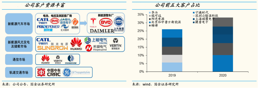 經(jīng)典案例:根據(jù)公司公告、wind、國(guó)金證券研究所等綜合資訊表明,憑借自身優(yōu)勢(shì),中熔電氣公司在各個(gè)領(lǐng)域積累了優(yōu)質(zhì)客戶群。在新能源市場(chǎng),公司熔斷器產(chǎn)品通過(guò)寧德時(shí)代、比亞迪供應(yīng)鏈、捷普電子等主流動(dòng)力電池、電控系統(tǒng)及配套廠商切入新能源汽車供應(yīng)鏈,終端用戶有特斯拉、比亞迪、上汽乘用車等國(guó)內(nèi)外主流新能源整車廠。2020 年公司前五大客戶占比 33%,寧德時(shí)代、陽(yáng)光電源分別為公司貢獻(xiàn)營(yíng)收 0.23、0.17 億元,合計(jì)占據(jù)18%的份額。