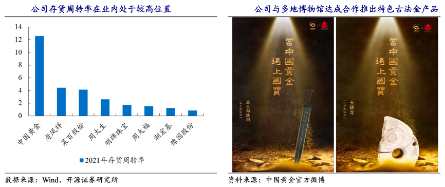 經(jīng)典案例:根據(jù)wind、中國黃金官方微博、開源證券研究所等綜合資訊表明,中國黃金公司作為國字號黃金珠寶品牌,金條產(chǎn)品深受消費(fèi)者信賴,其存貨周轉(zhuǎn)率明顯高于其他龍頭珠寶品牌,主要由于公司金條營收占比高,且在央企信譽(yù)背書、標(biāo)準(zhǔn)金 錠回收資質(zhì)加持下,公司金條產(chǎn)品更受市場認(rèn)可。金飾產(chǎn)品方面,公司發(fā)揮央企的資源優(yōu)勢,與故宮等國家單位達(dá)成合作,創(chuàng)新推出故宮金等古法金產(chǎn)品,迎合當(dāng)下年輕客群的國潮消費(fèi)趨勢,提振金飾銷售表現(xiàn)。