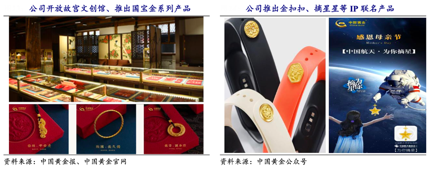 經(jīng)典案例:根據(jù)中國黃金報、中國黃金公眾號、中國黃金官網(wǎng)、開源證券研究所等綜合資訊表明,近年來國潮消費在年輕一代中興起,中國黃金精準定位年輕消費群體,2022 年 3 月,中國黃金故宮文創(chuàng)館正式開放,作為重要的文創(chuàng)產(chǎn)品展銷、文化傳播平臺,豐富了公司金飾產(chǎn)品的內(nèi)涵與表現(xiàn)手法,滿足人們對時尚、個性、設計感強的文化類黃金飾品需要。此外,公司還推出 IP 聯(lián)名產(chǎn)品,如與小米有品聯(lián)名推出金 扣扣、與中國航天基金會聯(lián)名推出摘星星系列產(chǎn)品等,不斷拓寬產(chǎn)品矩陣、開發(fā)高附加值產(chǎn)品,圈粉年輕消費群體。