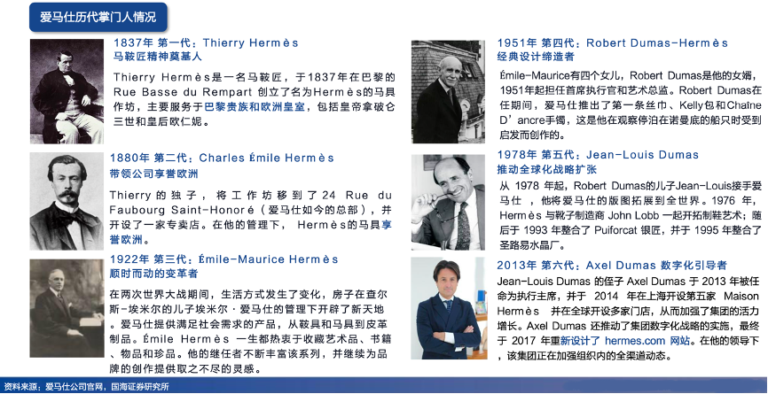 經(jīng)典案例:根據(jù)愛馬仕公司官網(wǎng)、國(guó)海證券研究所等綜合資訊表明,愛馬仕六代掌門人均來自愛馬仕家族。