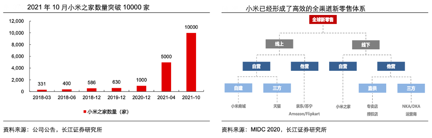 經(jīng)典案例:根據(jù)公司公告、MMIDC2020、長江證券研究所等綜合資訊表明,2021年以來小米加大了對線下渠道的布局力度,截至 2021 年 10 月小米之家的數(shù)量已經(jīng)突破一萬家,目前已經(jīng)實現(xiàn)了95%的城市覆蓋,80%的縣城覆蓋和 4%的鄉(xiāng)鎮(zhèn)覆蓋,其全國門店標(biāo)準(zhǔn)化和線上線下統(tǒng)一化既能夠提升品牌形象,也有助于主力產(chǎn)品更好的觸達(dá)消費者。