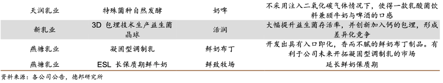經(jīng)典案例:根據(jù)各公司公告、德邦研究所等綜合資訊表明,天潤乳業(yè)運用特殊菌種發(fā)酵技術(shù),生產(chǎn)出不注入二氧化碳氣體情況下,兼顧牛奶與啤酒口感的乳酸菌飲料奶啤,目前已成長為貢獻公司超 10%收入的高毛利大單品。新乳業(yè)將 3D 包埋技術(shù)生產(chǎn)的益生菌晶球加入活潤酸奶,大幅提升益生菌存活率,同時創(chuàng)新加入鈣的包埋,形成差異化競爭。