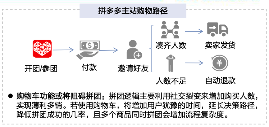 經(jīng)典案例:根據(jù)拼多多APP、國海證券研究所等綜合資訊表明,拼多多APP無購物車功能,縮短用戶決策路徑從而促進快速轉(zhuǎn)化:傳統(tǒng)購物車使用場景包括下 單決策過程、價格比較、合并付款、避免運費重復(fù)等,而拼多多APP設(shè)計無購物車功能,利用“商品收藏”代替購物車,簡化用戶購物程序,實現(xiàn)即買即走,縮短消費決策路徑和時間,從 而實現(xiàn)快速轉(zhuǎn)化。