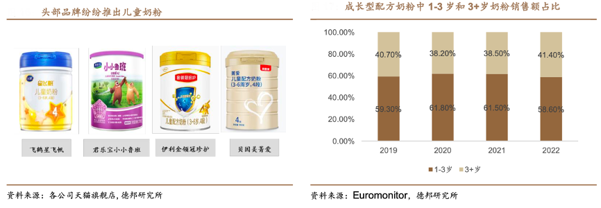 經(jīng)典案例:根據(jù)各公司天貓旗艦店、Euromonitor、德邦研究所等綜合資訊表明,洞察到兒童營養(yǎng)配方奶粉的增長需求,伊利、飛鶴、君樂寶等頭部乳企品牌也已紛紛推出針對 3 歲以上兒童的四段奶粉產(chǎn)品,留住龐大的消費群體,延長產(chǎn)品生命周期,從供給端帶動行業(yè)升級。