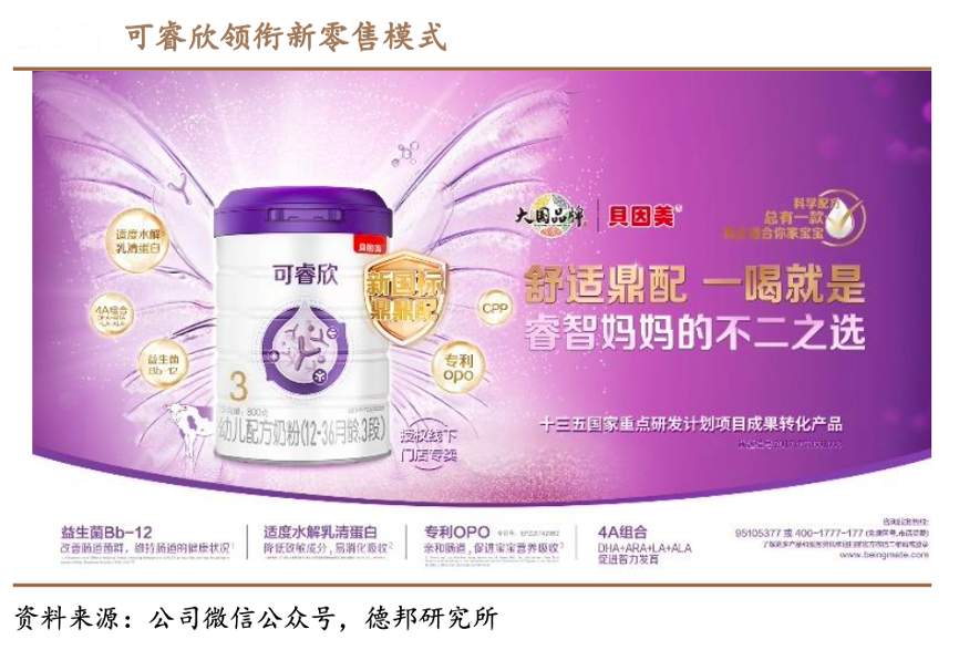 經(jīng)典案例:根據(jù)公司微信公眾號、德邦研究所等綜合資訊表明,貝因美2021 年度重點打造了“可睿欣”嬰幼兒配方乳粉,具有親舒腸道的功能,產(chǎn)品力強,復(fù)購率高。該產(chǎn)品自上市以來便定位新零售模式。新零售模式通過實時跟蹤價值鏈各環(huán)節(jié)的數(shù)據(jù)信息和用戶信息,將前后臺數(shù)據(jù)打通融合,極大提高了整個價值鏈的運行效率; 同時按照人、貨、場的概念,精準匹配門店、商圈及目標客戶,精細運維賦能終端門店。截止2022 年 11 月,可睿欣已覆蓋超過 1 萬家門店。