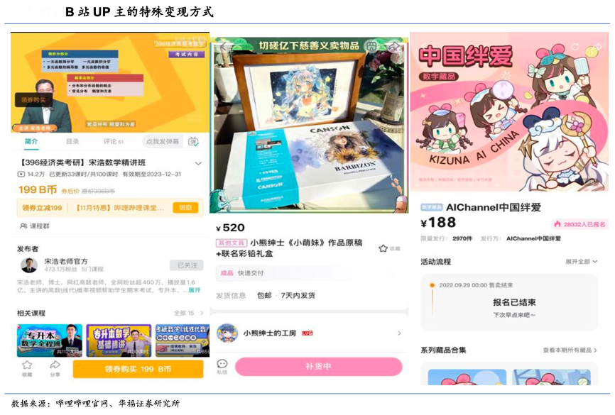 經(jīng)典案例:根據(jù)嗶哩嗶哩官網(wǎng)、華福證券研究所等綜合資訊表明,除了商單廣告外,B 站因為其不同于流量驅(qū)動的內(nèi)容生態(tài)特質(zhì),創(chuàng)作者們會有特殊的變現(xiàn)方式,知識區(qū)的 UP 主往往通過出售課程的方式獲得營收,手工繪畫區(qū)的 UP 主會在 B 站上出售自己的原創(chuàng)作品,而 Vtuber 即虛擬 UP 主可以通過發(fā)售其專屬衍生品如裝扮、表情包等獲得收入。