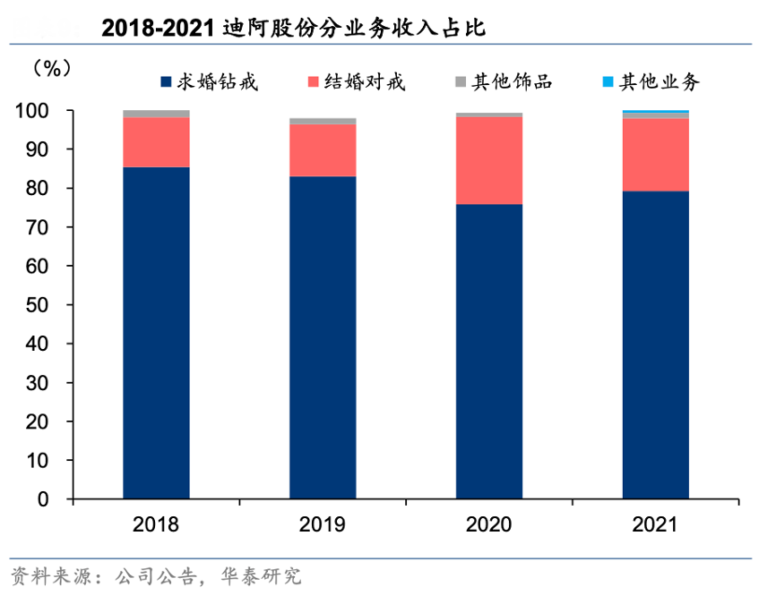 經(jīng)典案例:根據(jù)公司公告、華泰研究等綜合資訊表明,分產(chǎn)品看,迪阿公司“求婚鉆戒+結(jié)婚對戒”產(chǎn)品營收占比超九成。其品牌以“一生唯一真愛”為 主要宣傳著力點(diǎn),主打求婚鉆戒一生只能定制一枚(升級換款除外)。求婚鉆戒營收占比高,2021年占營收 79.2%;結(jié)婚對戒次之,2021年?duì)I收占比 18.7%。
