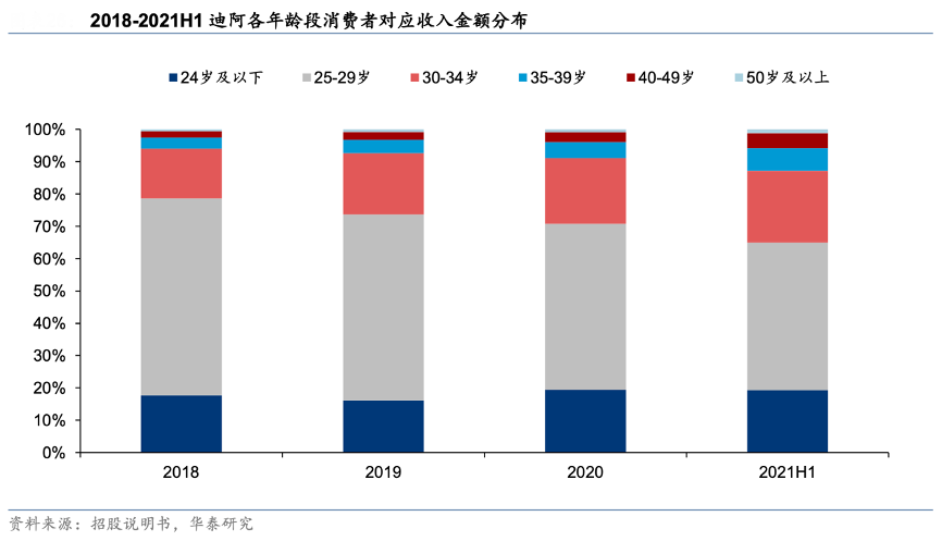 經(jīng)典案例:根據(jù)招股說明書、華泰研究等綜合資訊表明,迪阿公司的主力消費(fèi)者為 29 歲及以下的年輕消費(fèi)群體,社媒、電商、短視頻等營銷方式也使得 DR 實(shí)現(xiàn)與年輕人同頻共振并獲得眾多年輕群體的消費(fèi)青睞。同時,品牌力的泛化也讓越來越多的非婚慶消費(fèi)群體選擇購買 DR 表達(dá)愛意。2021H1,34歲及以下消費(fèi)者銷售額占公司銷售總額 87.2%,適婚人群仍為主力消費(fèi)者;同時,35歲以上消費(fèi)者占比逐步提升,印證了 DR 在非婚慶場景的品牌影響力。