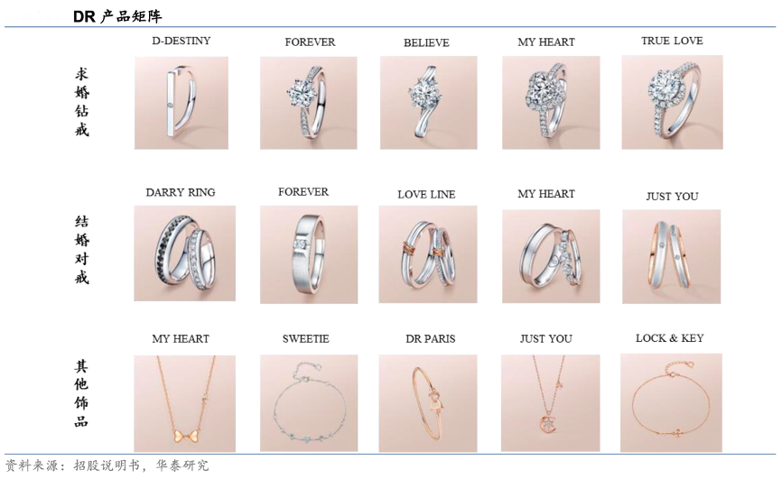 經(jīng)典案例:根據(jù)招股說明書、華泰研究等綜合資訊表明,迪阿公司打造了豐富的產(chǎn)品矩陣,截至 2021 年底,其共推出求婚鉆戒 70 余款、結(jié)婚對戒 170 余款以及其他飾品 200 余款。婚戒主打系列包括 FOREVER 系列簡奢款、FOREVER 系列經(jīng)典款、MY HEART 簡奢款、TURE LOVE 典雅款。