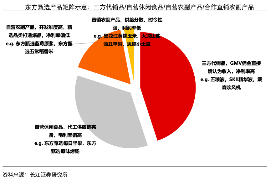 經(jīng)典案例:根據(jù)長(zhǎng)江證券研究所等綜合資訊表明,東方甄選構(gòu)建了系列產(chǎn)品矩陣,打破傳統(tǒng)品類(lèi)運(yùn)行的機(jī)制,推動(dòng)三方代銷(xiāo)品、自營(yíng)休閑食品、自營(yíng)農(nóng)副產(chǎn)品等多樣化產(chǎn)品的戰(zhàn)略協(xié)同。