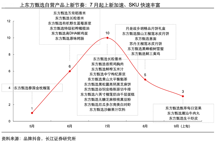 經(jīng)典案例:根據(jù)品牌抖音、長(zhǎng)江證券研究所等綜合資訊表明,東方甄選自營(yíng)產(chǎn)品快速上新,品類(lèi)明顯豐富,根據(jù)不完全統(tǒng)計(jì),自營(yíng) SKU5 月~9 月上新數(shù)分別為 1、 6、10、6、20 款,速度明顯加快;品類(lèi)選擇有所鋪開(kāi),不僅是農(nóng)副產(chǎn)品、更增加了多款 產(chǎn)業(yè)鏈更成熟、盈利能力更穩(wěn)定的零食飲品,迅速構(gòu)筑起東方甄選新模式的盈利核心。