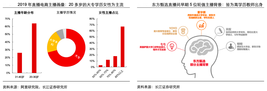 經典案例:根據阿里研究院、長江證券研究所等綜合資訊表明,東方甄選直播間沿襲、外現了企業(yè)文化,主播背景、直播風格獨樹一幟。對比行 業(yè)主播“20 多歲大專學歷女性”的典型畫像,東方甄選最初的 5 名輪班主播中 3 人來 自國內 985/211 大學、2 人來自境外/海外院校。