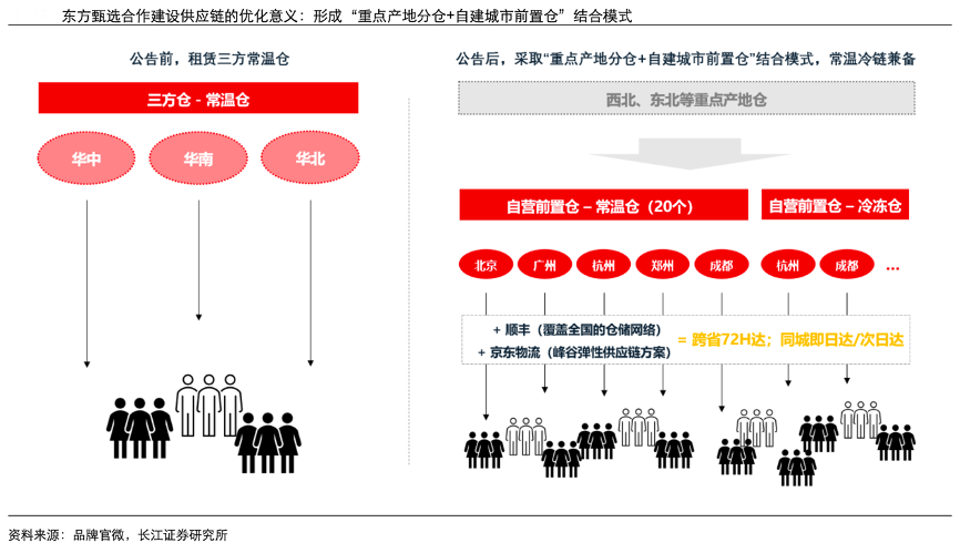 經典案例:根據品牌官微、長江證券研究所等綜合資訊表明,東方甄選公司借助行業(yè)龍頭的能力為自營品建設 5 城 20 個前置倉,形成“重點產地分倉+自建成 時前置倉”結合的倉儲層次,并配置了了冷凍前置倉,為冷鏈產品發(fā)展打好基礎;此外,順豐覆蓋全國的倉儲網絡、京東在購物街中打磨的彈性供應鏈方案,都將賦能東方甄選產品發(fā)展。