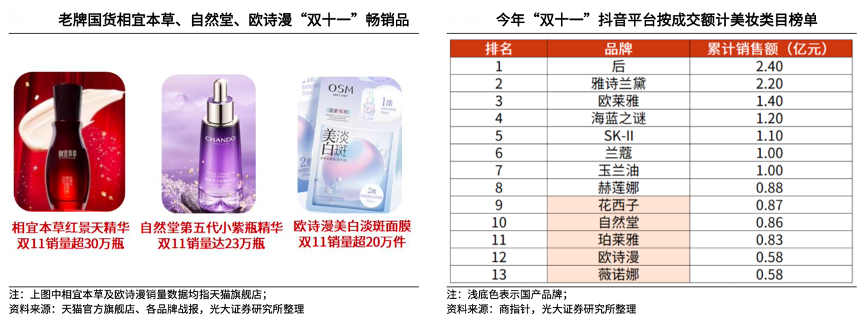 優(yōu)秀案例:根據(jù)天貓官方旗艦店、商指針、各品牌戰(zhàn)報、光大證券研究所等綜合資訊表明,部分老牌國貨通過聯(lián)合超頭主播實現(xiàn)單品打爆、使品牌再次出 圈,如“雙十一”期間,相宜本草天貓旗艦店 GMV 突破 2 億元、同比增長 超 88%,旗下紅景天系列煥白精華液銷量超 30 萬瓶、龍膽系列凍干精華面膜銷 量超 319 萬盒;自然堂第五代小紫瓶精華累計售出 23 萬瓶;歐詩漫美白淡斑面 膜銷量超 20 萬件。