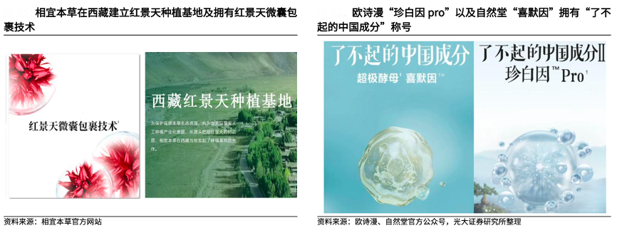 優(yōu)秀案例:根據(jù)相宜本草官方網(wǎng)站、歐詩漫、自然堂官方公眾號、光大證券研究所等綜合資訊表明,老牌國貨相宜本草、歐詩漫以及自然堂均有各自代表專利技術(shù)或成分。其中,相宜本草專注于中草藥的開發(fā)、積累了 32 項發(fā)明專利,自 2010 年以來 12 年其專 研紅景天、先后在西藏建立了三個紅景天種植基地,同時在紅景天煥亮精華液等 爆品上,其累計開展了超 290 項臨床研究、近 4 萬人參與到產(chǎn)品臨床測試中; 歐詩漫深耕珍珠研究,近十年來相繼取得亞微米粉體技術(shù)、珍珠與護(hù)膚品的復(fù)配技術(shù)、珍珠多肽提純技術(shù),擁有發(fā)明專利 89 項,旗下?lián)碛袑@腊壮煞?ldquo;珍白 因 pro”。