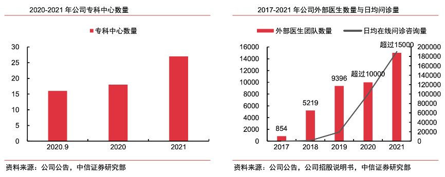 經(jīng)典案例:根據(jù)公司公告、公司招股說明書、中信證券研究部等綜合資訊表明,京東健康公司近年來成立了包括心臟中心、耳鼻喉中心、感染及肝病中心、腦營養(yǎng)中心等多個(gè)??浦行?,截至 2021 年底共擁有 27 個(gè)??浦行?,吸引了百余位專家和頂級(jí)名醫(yī)加入。同時(shí),公司通過??浦行倪B接更多的外部優(yōu)質(zhì)醫(yī)療資源,外部醫(yī)生團(tuán)隊(duì)覆蓋超過 15000 家醫(yī)院。2022H1,公司推出專家在線、秒問京醫(yī)、夜間急診三項(xiàng)問診服務(wù),日均在線問診咨詢量超過 25 萬次。