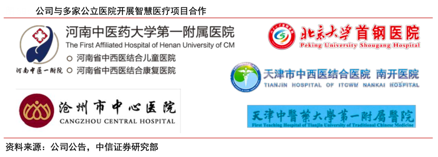 經(jīng)典案例:根據(jù)公司公告、中信證券研究部等綜合資訊表明,京東健康公司近年來加速布局智慧醫(yī)療領(lǐng)域,其已與多家醫(yī)院展開合作:2020 年與天津市南開醫(yī)院合作搭建南開京東互聯(lián)網(wǎng)醫(yī)院,實(shí)現(xiàn)包括在線復(fù)診、健康咨詢等一體化服務(wù);2021年與河南中醫(yī)藥大學(xué)第一附屬醫(yī)院共建互聯(lián)網(wǎng)醫(yī)院,年底累計(jì)注冊(cè)患者人數(shù)接近 15 萬;此外,公司還與首都醫(yī)科大學(xué)附屬北京地壇醫(yī)院達(dá)成戰(zhàn)略合作,幫助建立互聯(lián)網(wǎng)醫(yī)院。