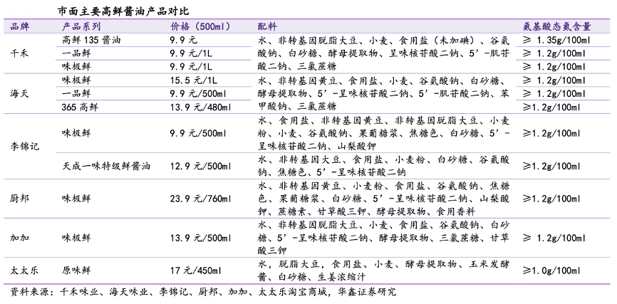 經典案例:根據(jù)千禾味業(yè)、海天味業(yè)、李錦記、廚邦、加加、太太樂淘寶商城和華鑫證券研究等綜合資訊表明,為切入主流的高鮮醬油市場,千禾相繼推出高鮮 135、一品鮮、味極鮮等產品,并確定了“零添加為主,高鮮為輔”的發(fā)展戰(zhàn)略。從價格來看,公司高鮮產品價值均在 10 元左右,具備一定的性價比優(yōu)勢。目前全國的高鮮市場逐漸成熟,千禾適時推出能夠搶占市場,填補 8-15 元價格帶,充分享受高鮮市場的紅利。
