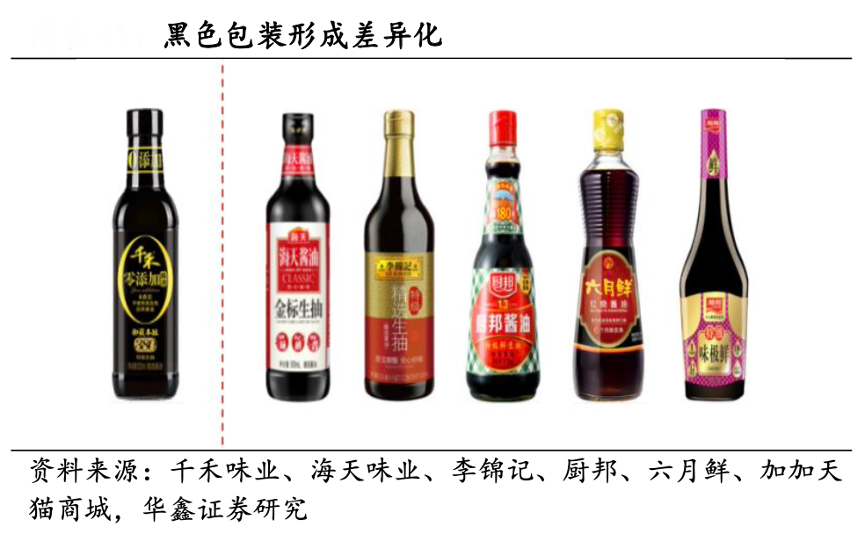 經典案例:根據(jù)千禾味業(yè)、海天味業(yè)、李錦記、廚邦、六月鮮、加加天貓商城和華鑫證券研究等綜合資訊表明,千禾公司通過全新的黑色包裝也與其他品牌五顏六色的包裝形成差異化的產品形象,能夠在超市的商品展柜上一目了然。