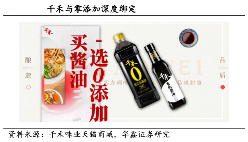 經(jīng)典案例:根據(jù)千禾味業(yè)天貓商城、華鑫證券研究等綜合資訊表明,千禾經(jīng)過 10 余年的宣傳和消費(fèi)者培育,零添加概念已經(jīng)深入人心。公司“零添加”產(chǎn)品 占比超過50%,并以優(yōu)異的品質(zhì)和良好的品牌形象得到行業(yè)和消費(fèi)者的認(rèn)可,多次獲得行業(yè) 獎(jiǎng)項(xiàng)以及四川名品牌稱號(hào)。目前千禾已經(jīng)與零添加深度綁定,在消費(fèi)者層面形成了“千禾= 零添加”的品牌印記,占據(jù)消費(fèi)者心智。