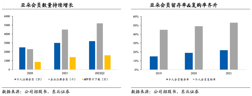 經(jīng)典案例:根據(jù)公司招股書、東北證券等綜合資訊表明,亞朵通過 A-Card 會員計劃培養(yǎng)客戶忠誠度和粘性,會員基數(shù)快速增長,2016-2021年個人會員復(fù)合增速為 48.7%,30 歲以下注冊會員復(fù)合增速為 83.9%,截至 2022Q2 公司注冊個人會員數(shù)達(dá) 3200 萬。2019-2021 年公司會員留存率分別為 14.8%/19.4%/21.7%,復(fù)購率分別為44.6%/48.7%/52.8%,會員黏性持續(xù)提升, 打造私域流量蓄水池。